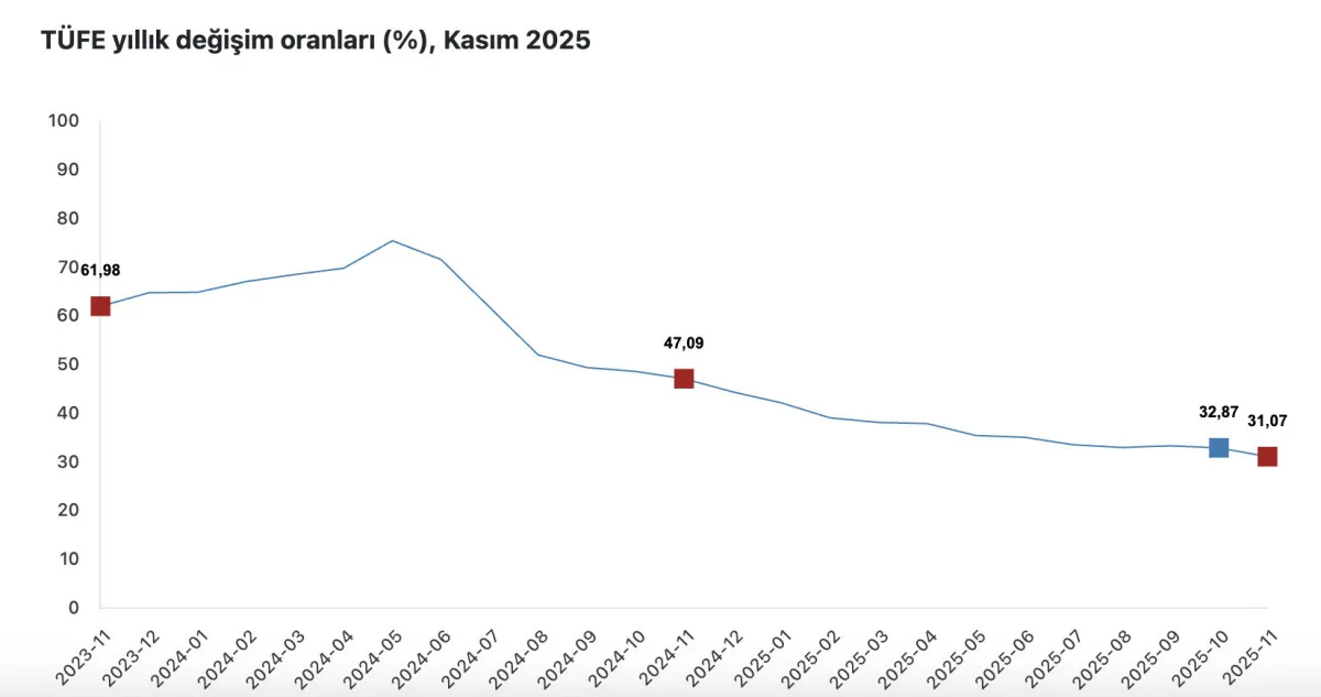 Özel kapsamlı TÜFE göstergesi (B) ise işlenmemiş gıda, enerji, alkollü içkiler ve tütün ile altın hariç hesaplandığında, kasım ayında bir önceki aya göre %1,27, yıllık bazda %32,17 artış gösterdi. Bu göstergeler, temel tüketim ürünlerindeki fiyat artışının ekonomi üzerindeki gerçek etkisini daha net ortaya koyuyor.